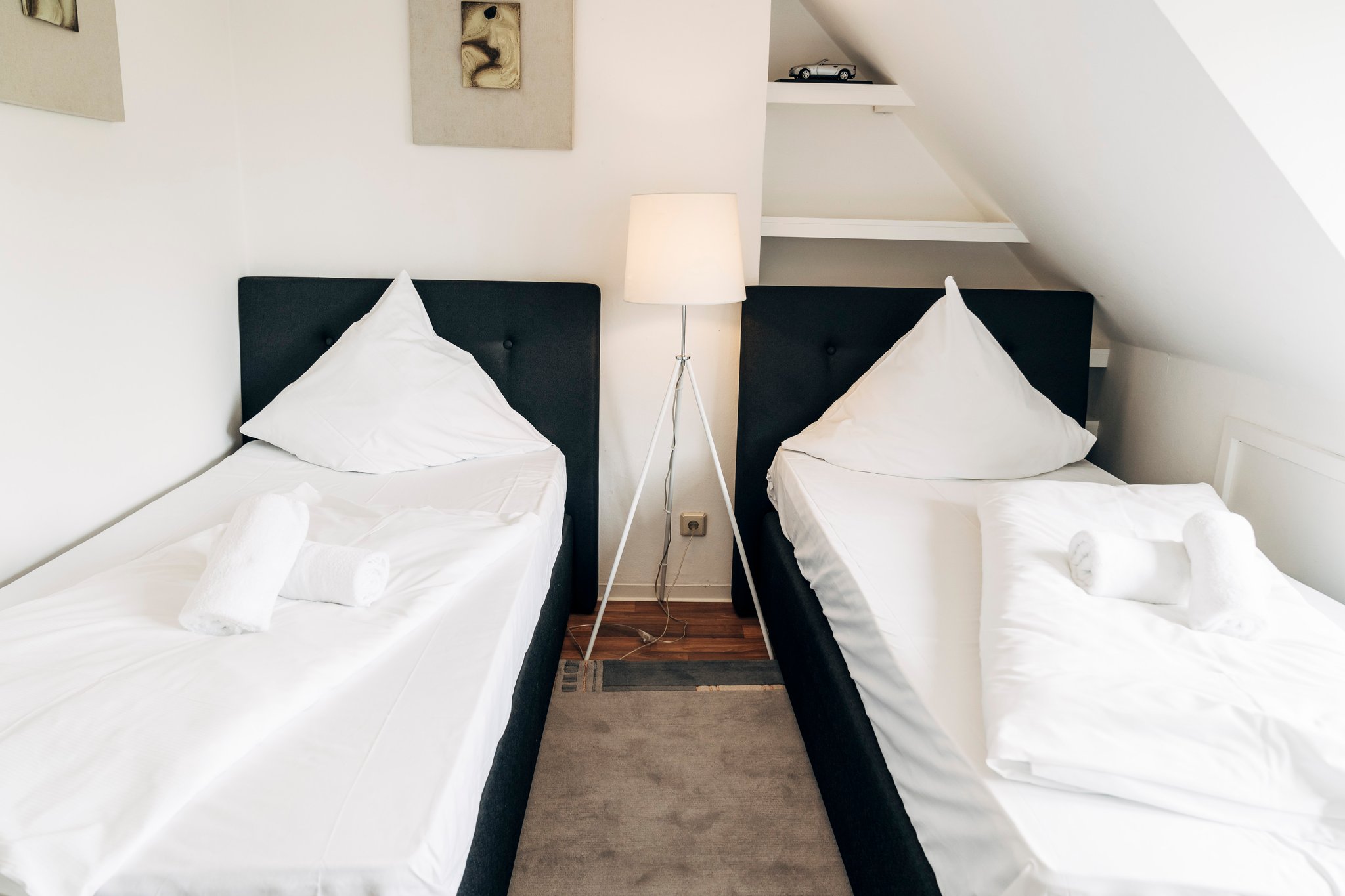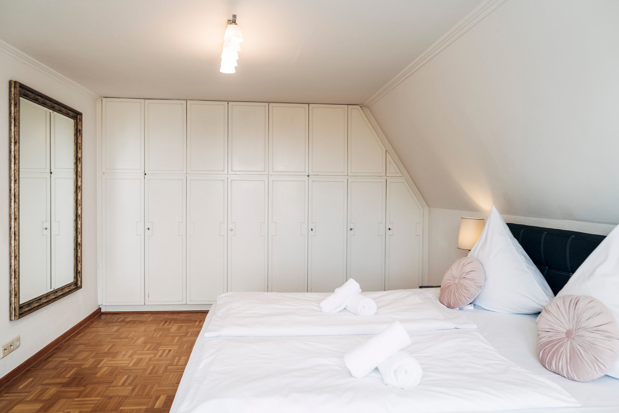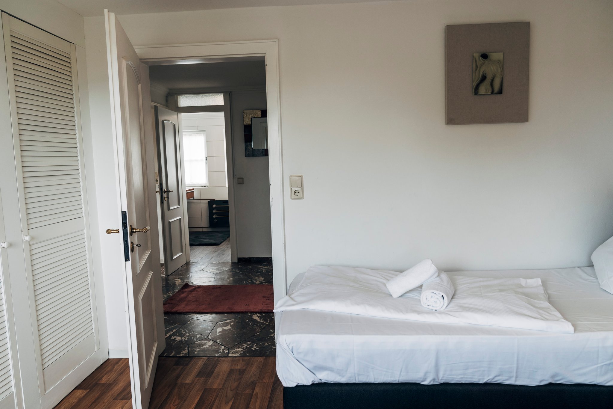 Die Wohnung bietet Platz für regulär 4 Personen in zwei getrennten Schlafzimmern, davon ein Schlafzimmer mit Doppelbett. Das andere Schlafzimmer mit 2 Einzelbetten, die auch zusammen geschoben werden können.