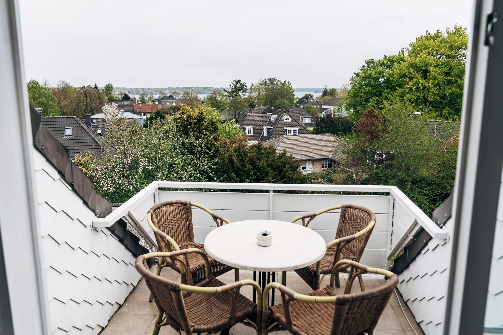 Ein kleiner Balkon mit direkten Blick auf die Förde, ist mit einem runden Tisch und 4 Stühlen ausgestattet. Es bietet sich gerade in den Sommermonaten,
