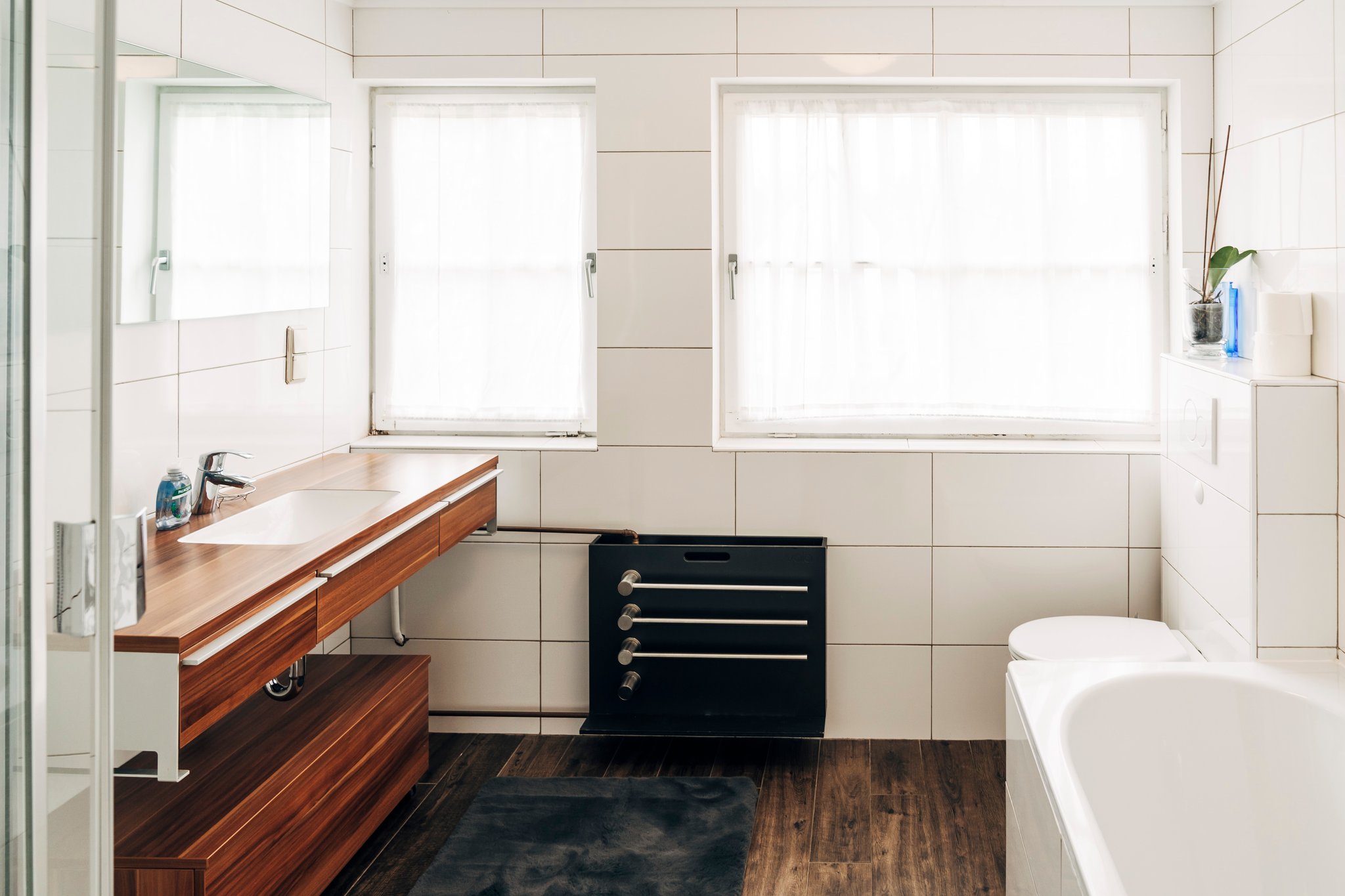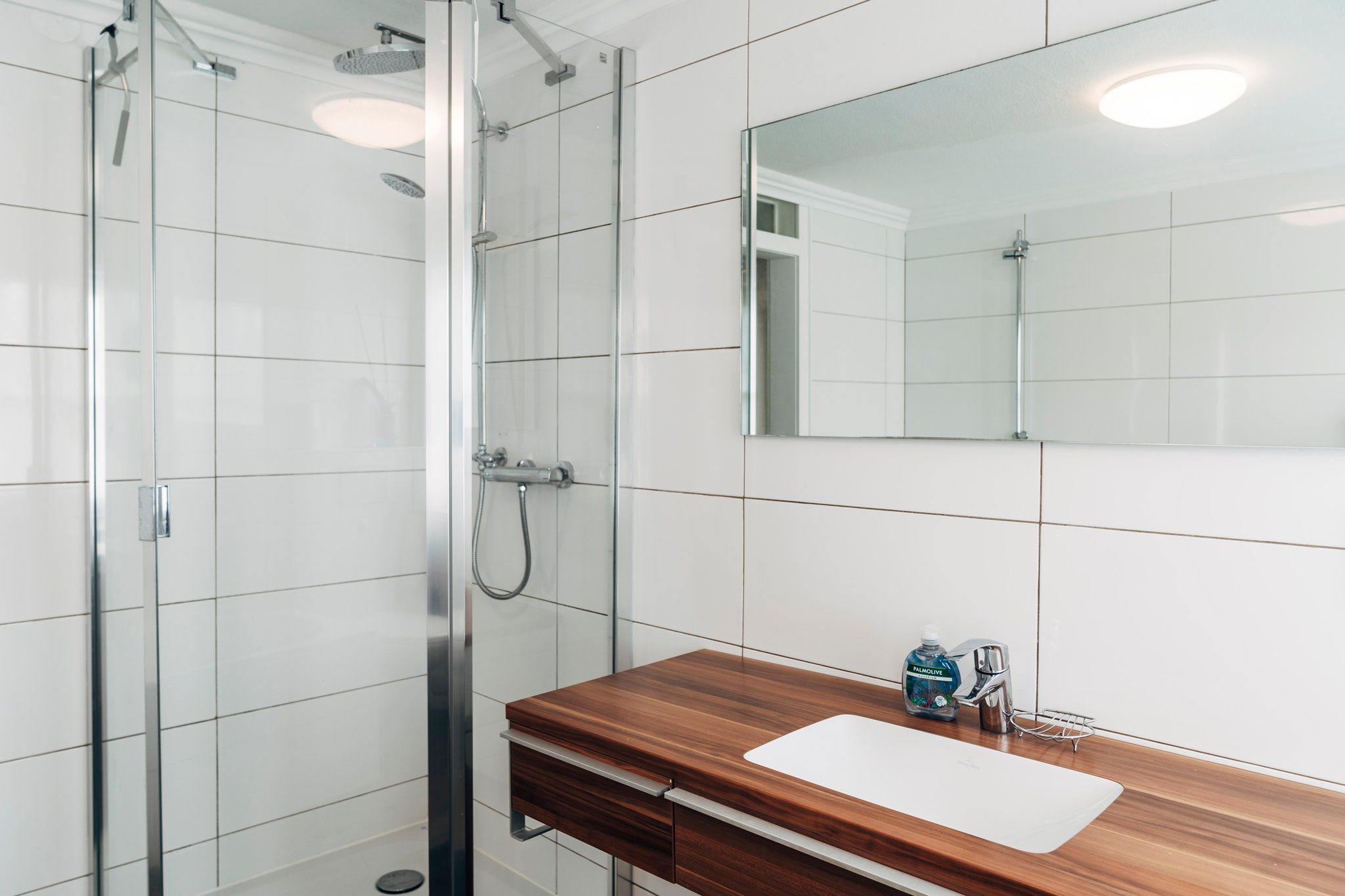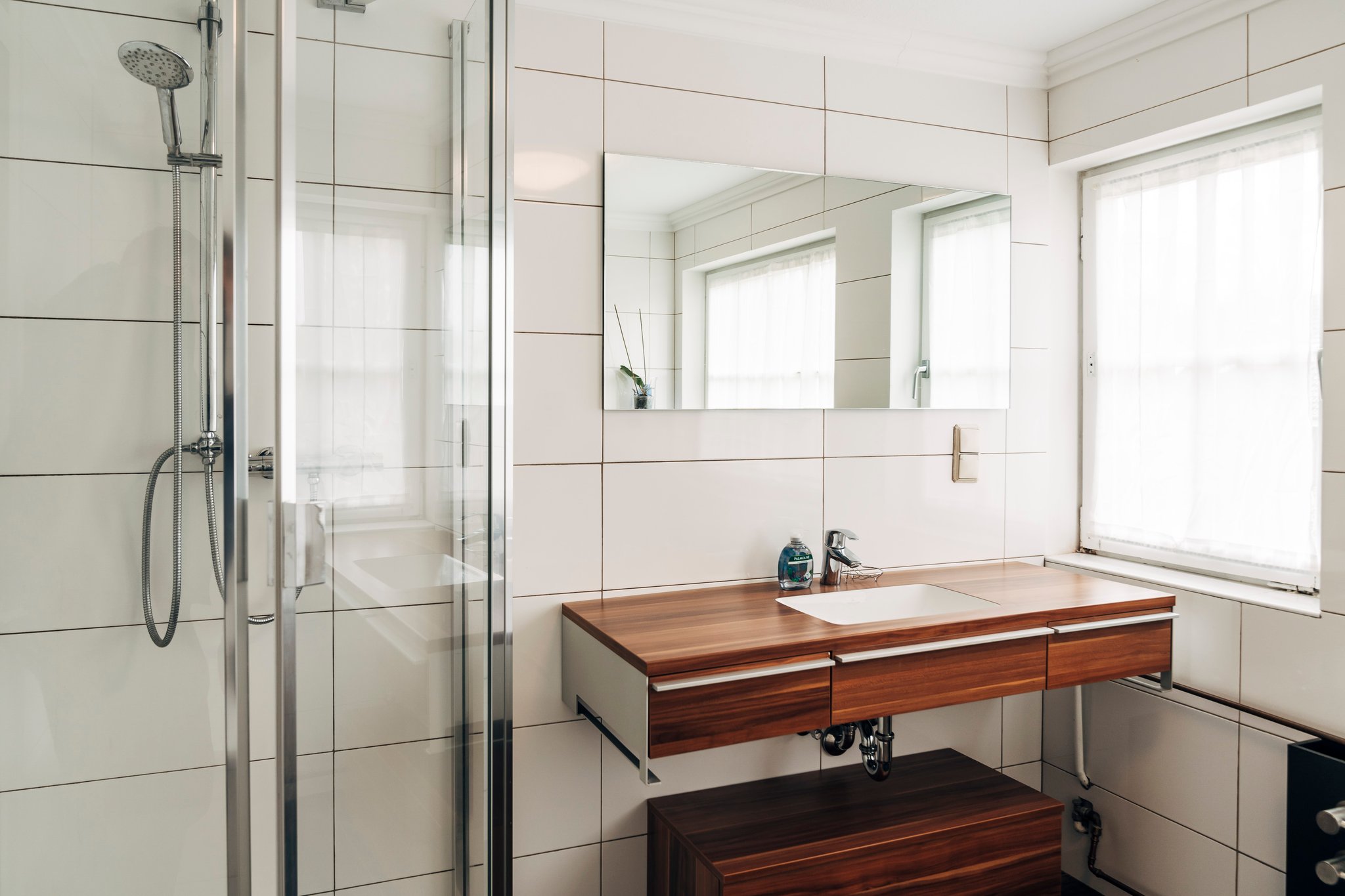 In der Wohnung befindet sich ein großes Tageslicht-Badezimmer mit Dusche und Badewanne und ein separates kleines Gäste-WC, mit Wschbecken und Toilette.
