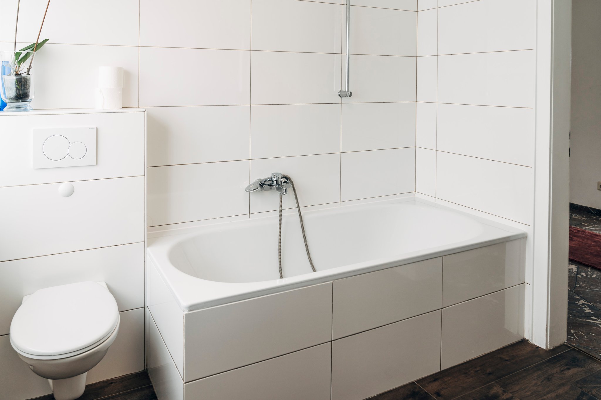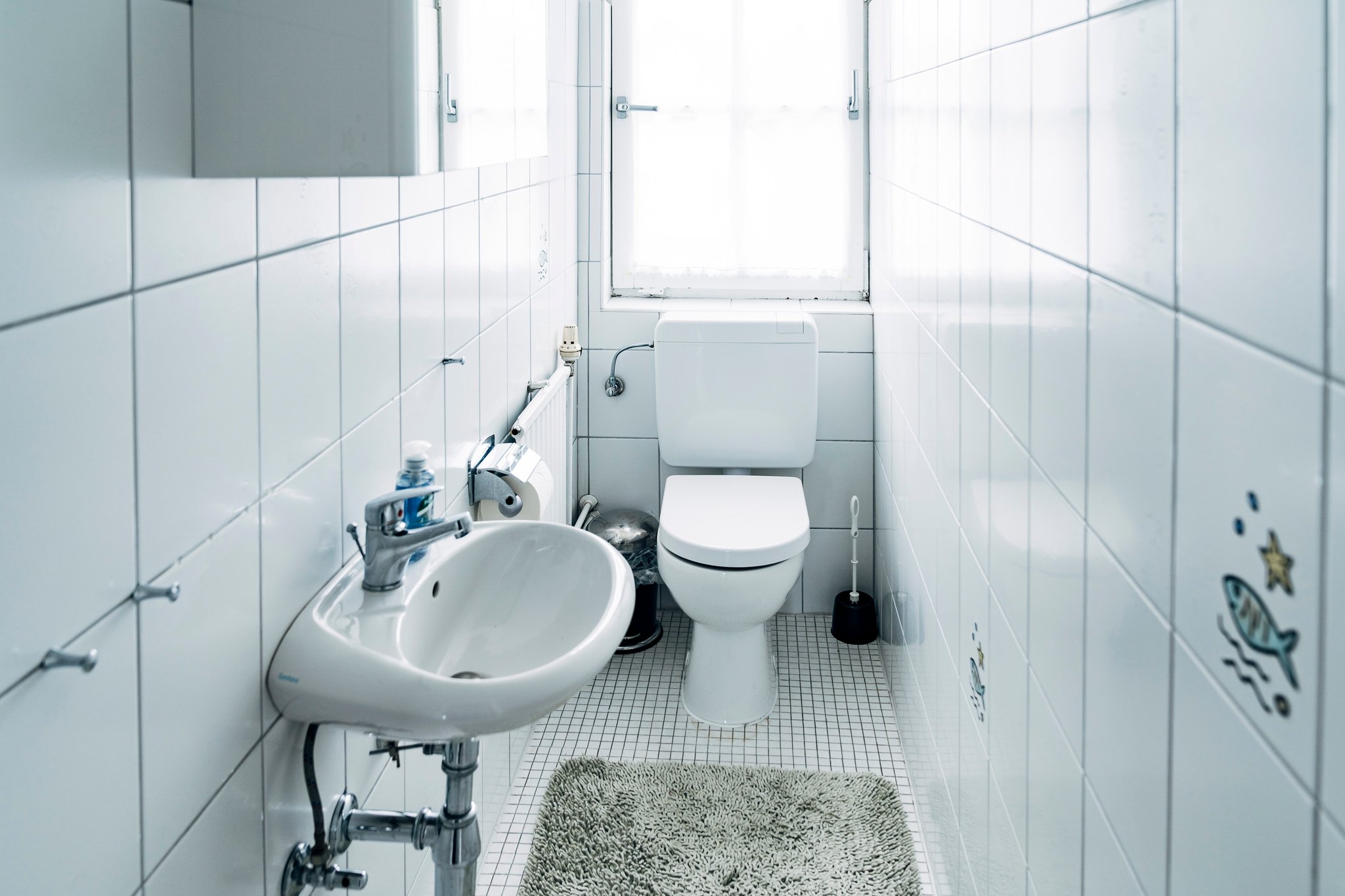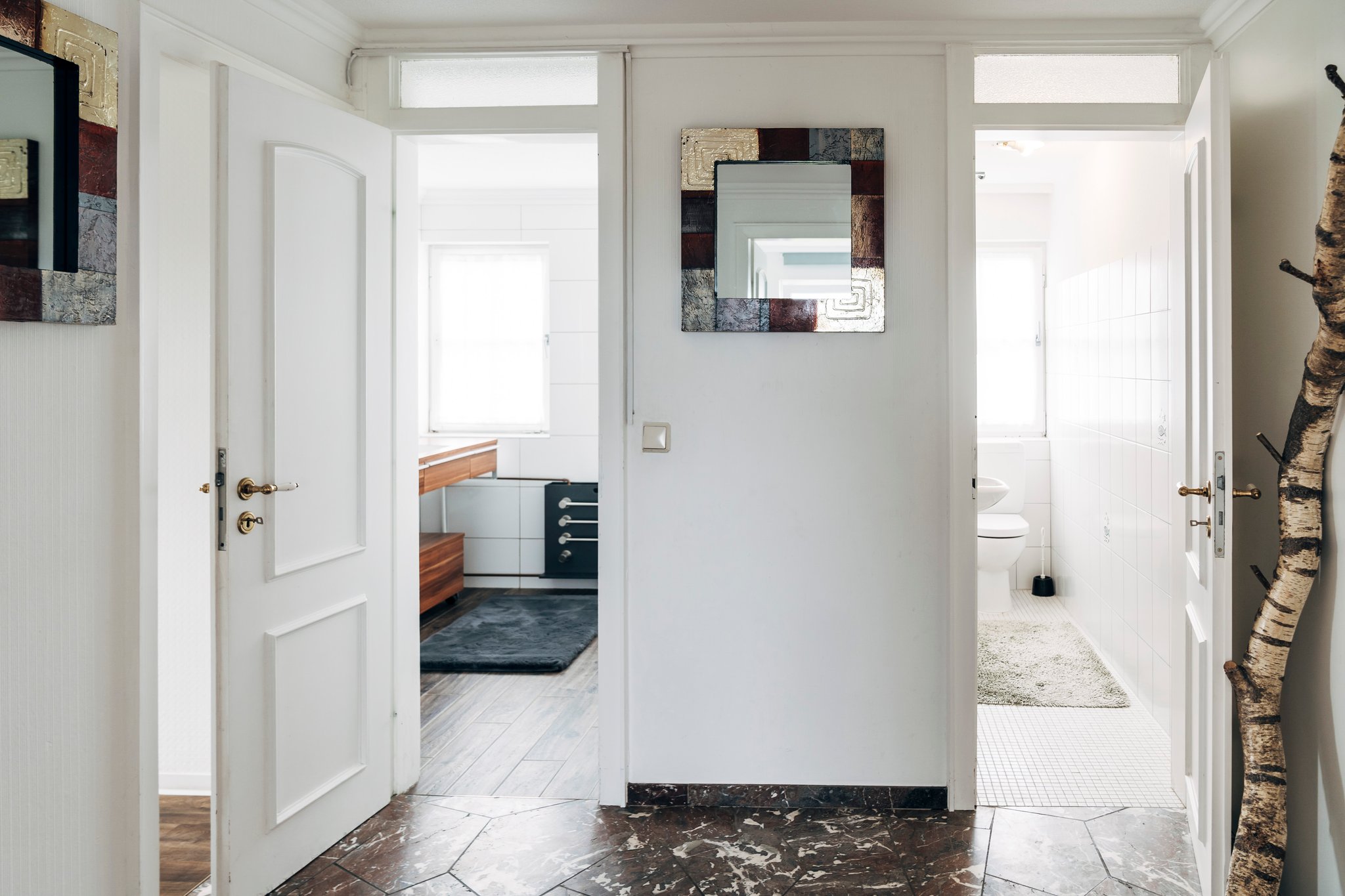 In der Wohnung befindet sich ein großes Tageslicht-Badezimmer mit Dusche und Badewanne und ein separates kleines Gäste-WC, mit Wschbecken und Toilette.