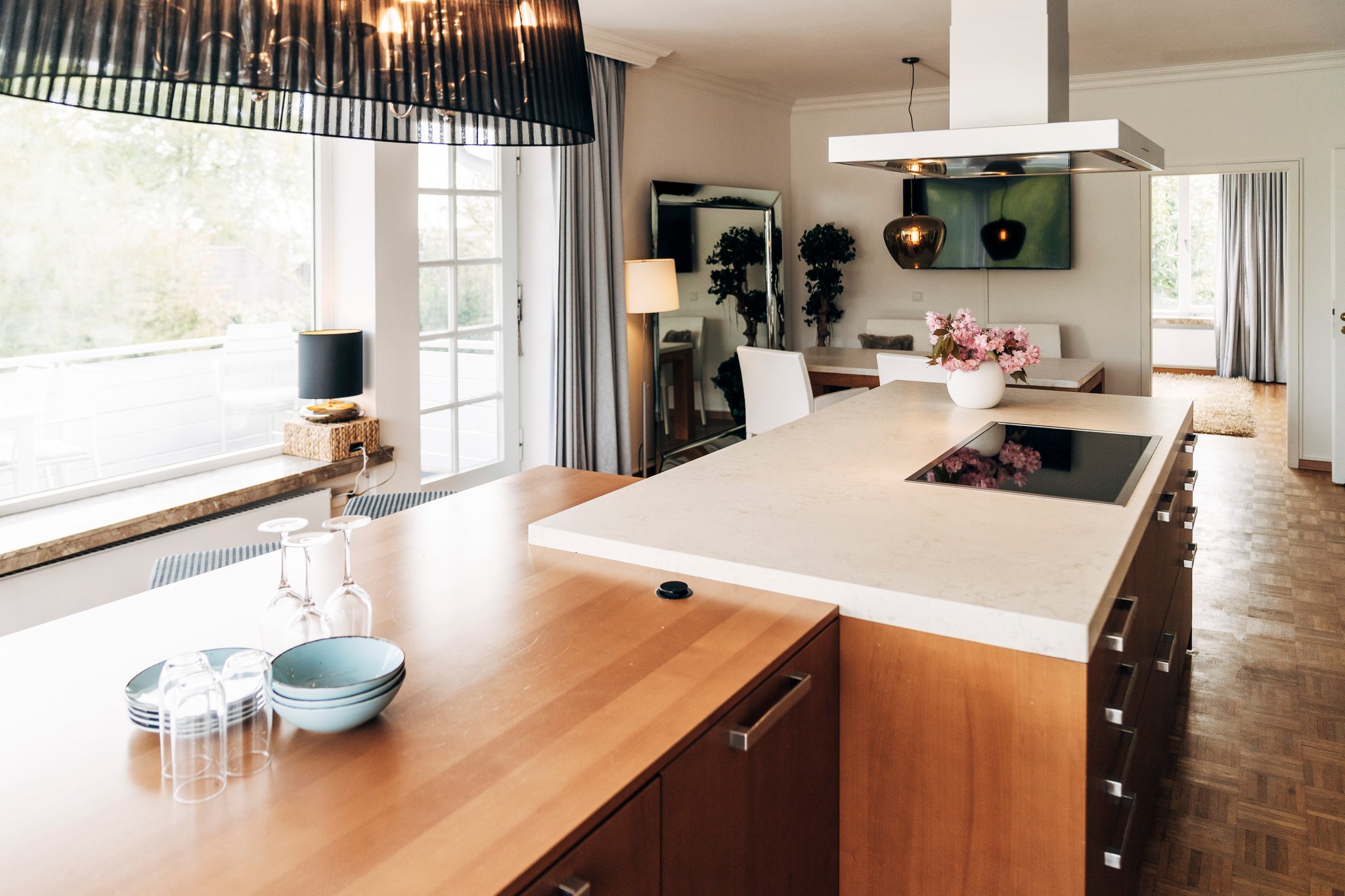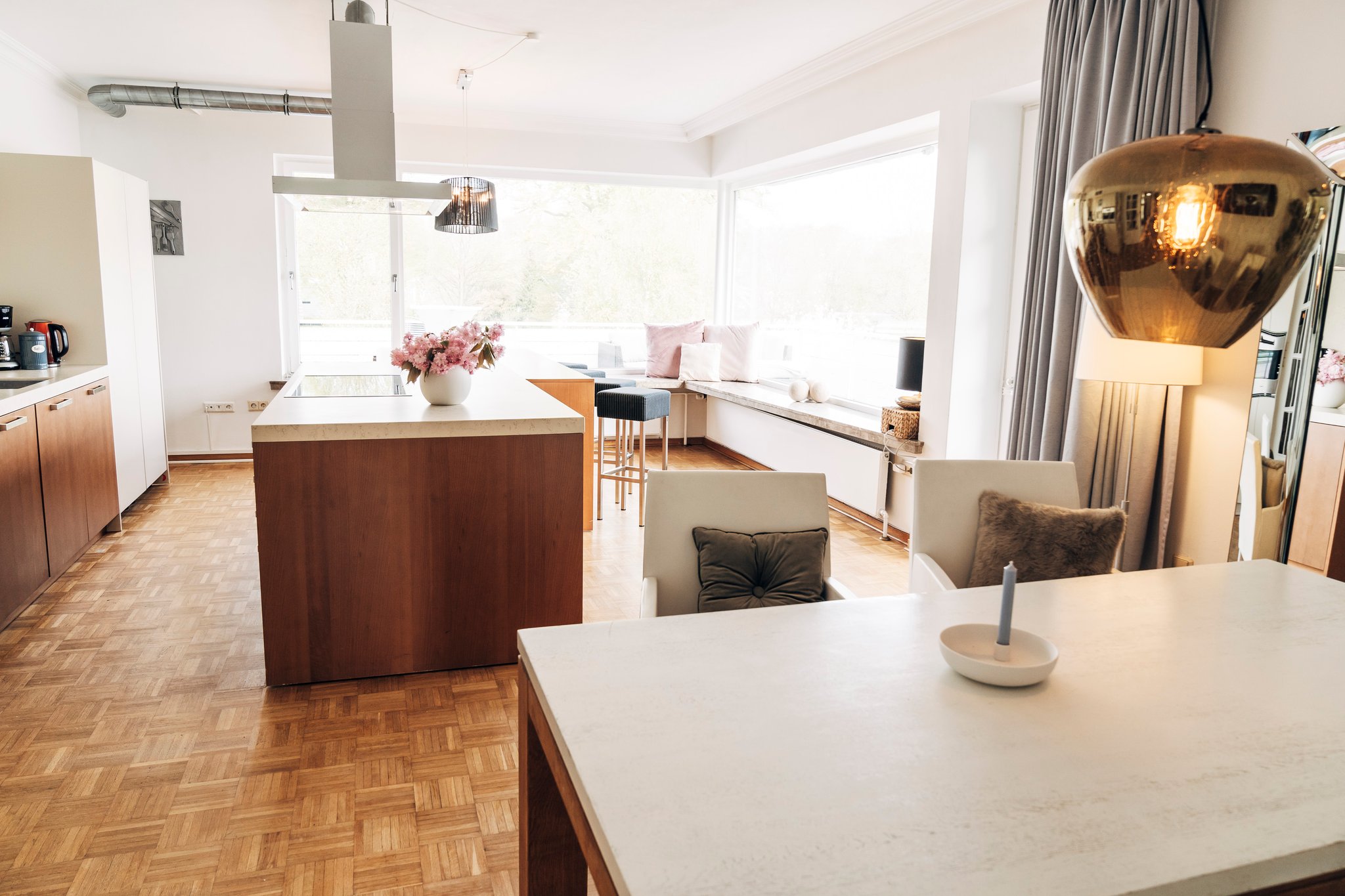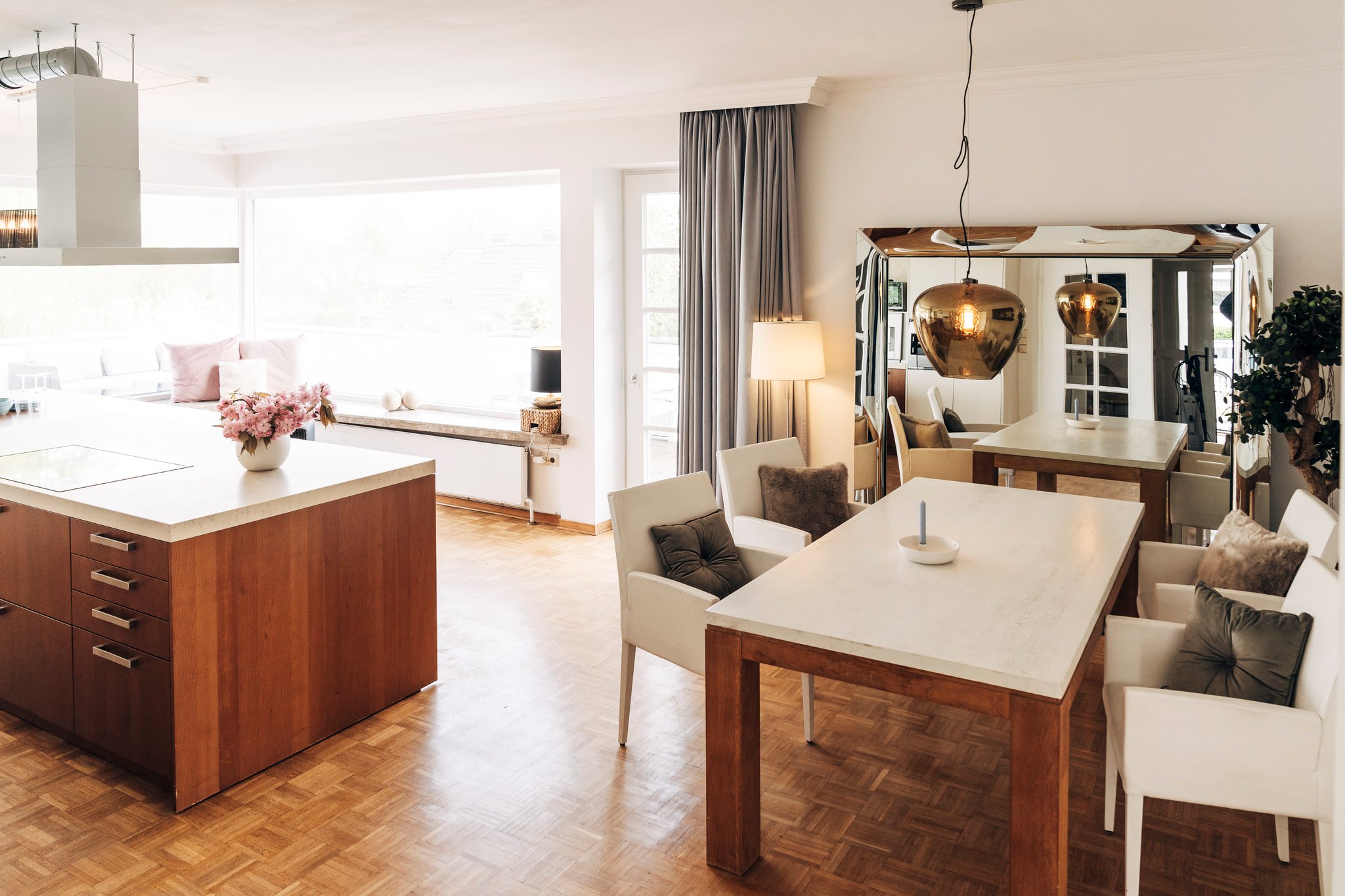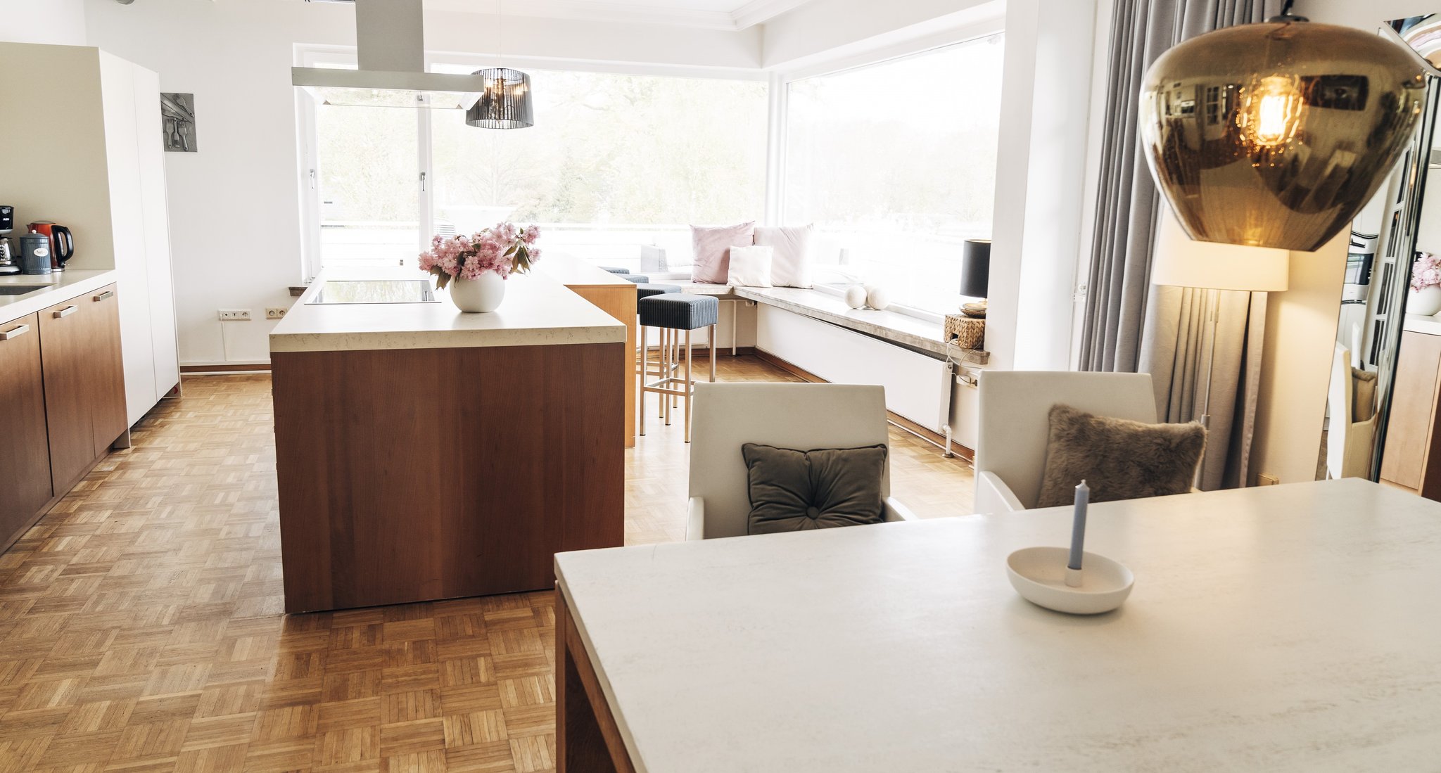 Der offene Wohn- und Essbereich, fügt sich harmonisch mit der hochwertigen Einbauküche, dem Tresen mit Barhockern und dem Esstisch, vor der großen Fensterfront zusammen.