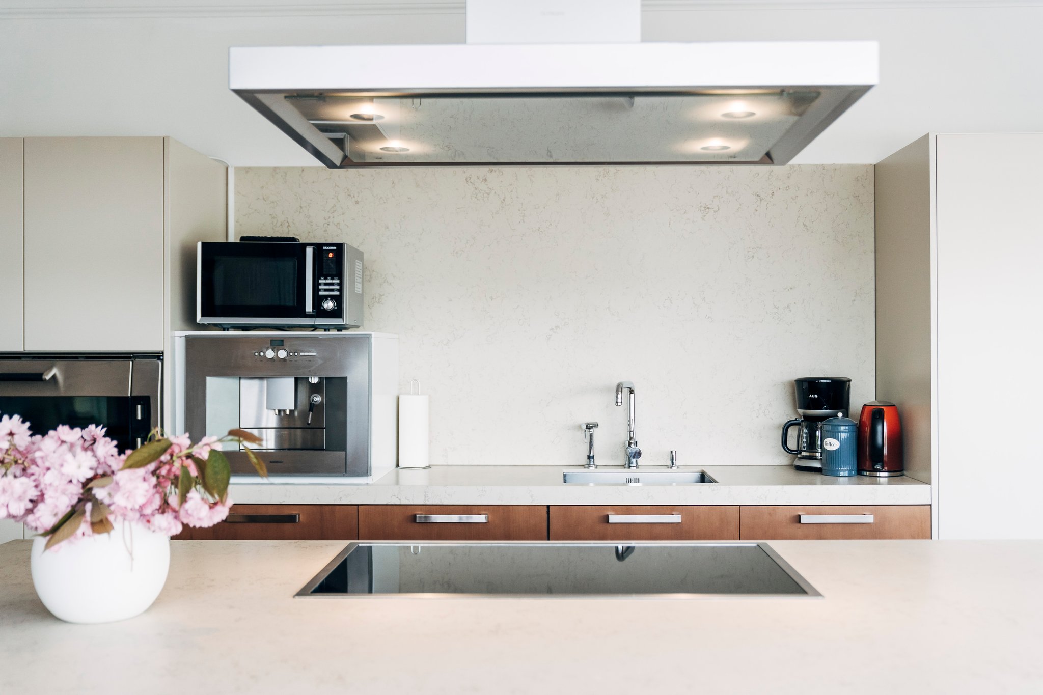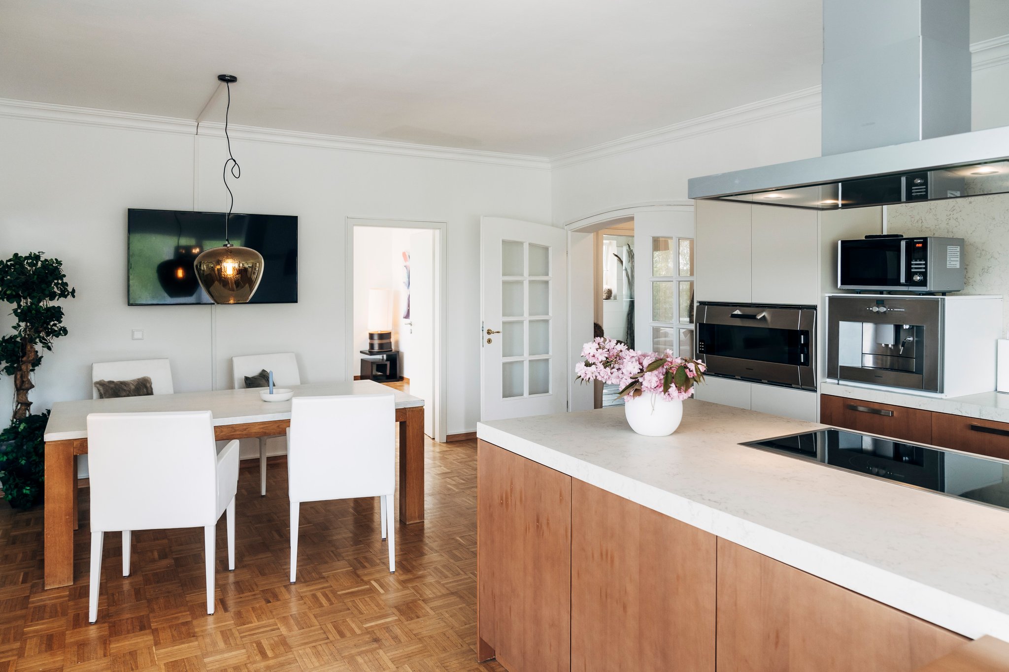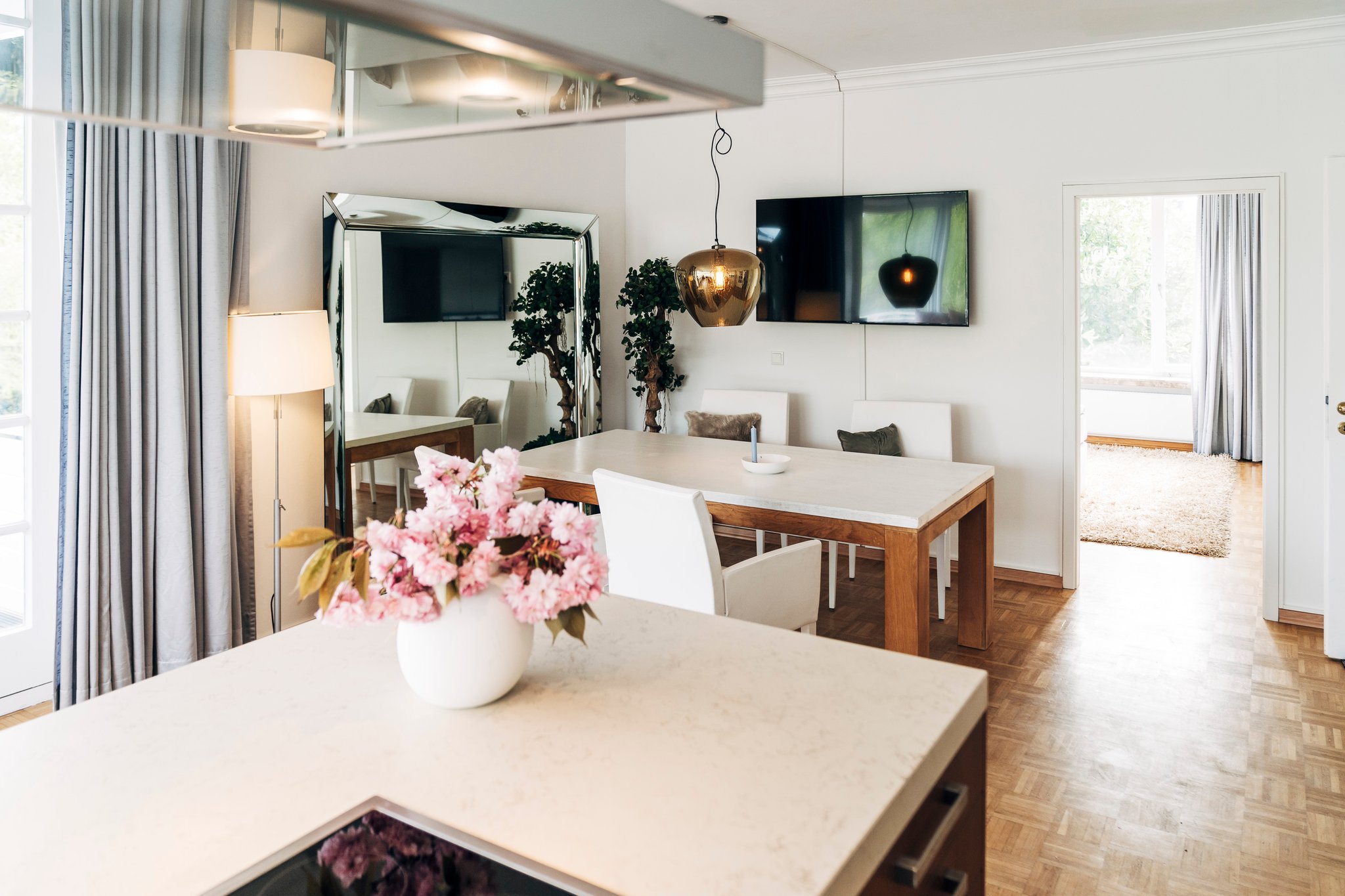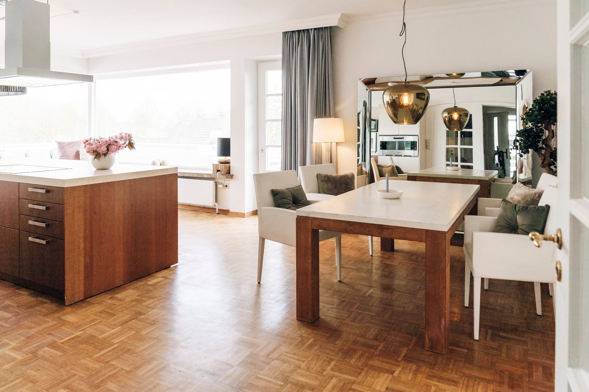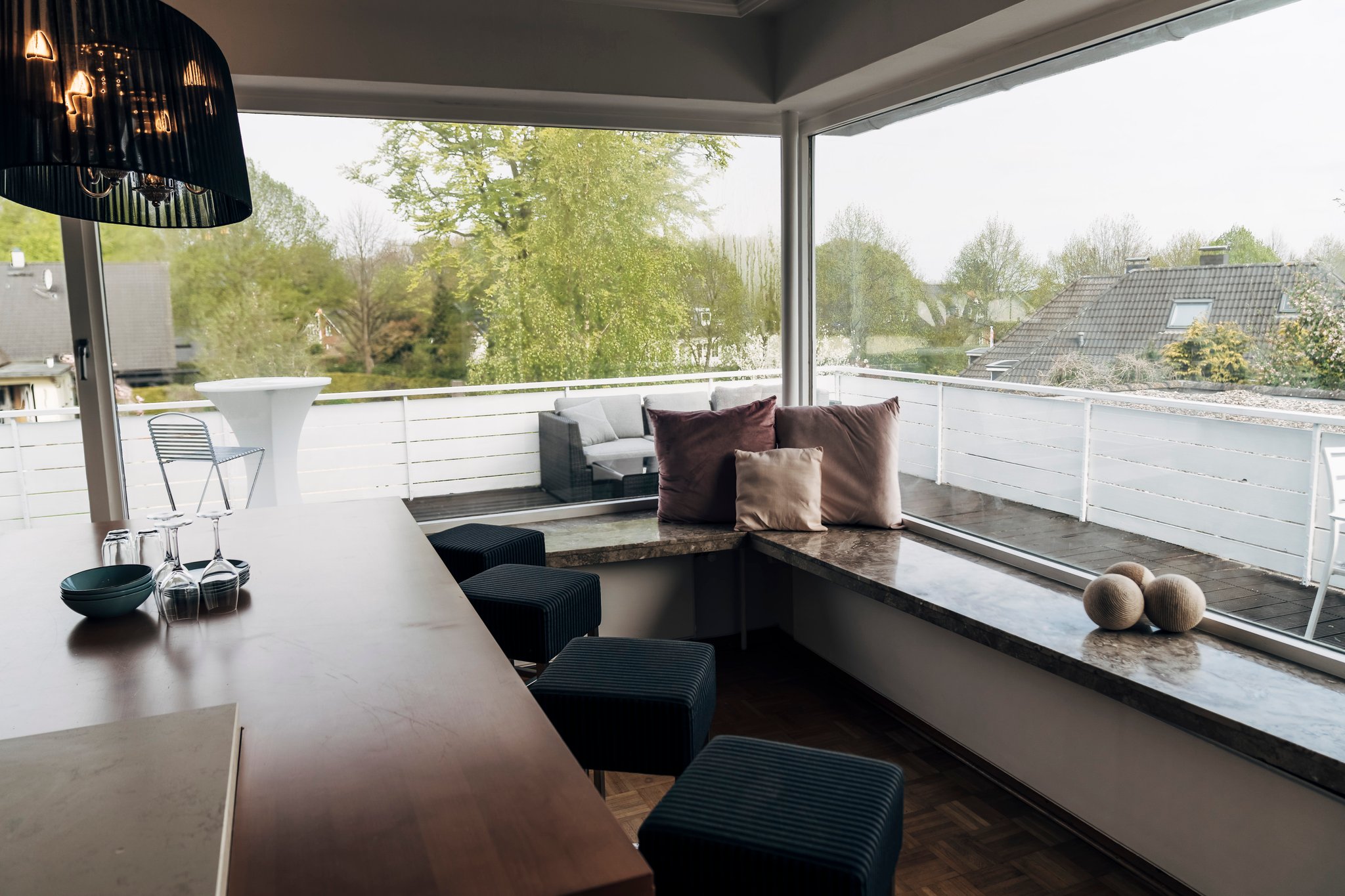 Der offene Wohn- und Essbereich, fügt sich harmonisch mit der hochwertigen Einbauküche, dem Tresen mit Barhockern und dem Esstisch, vor der großen Fensterfront zusammen.