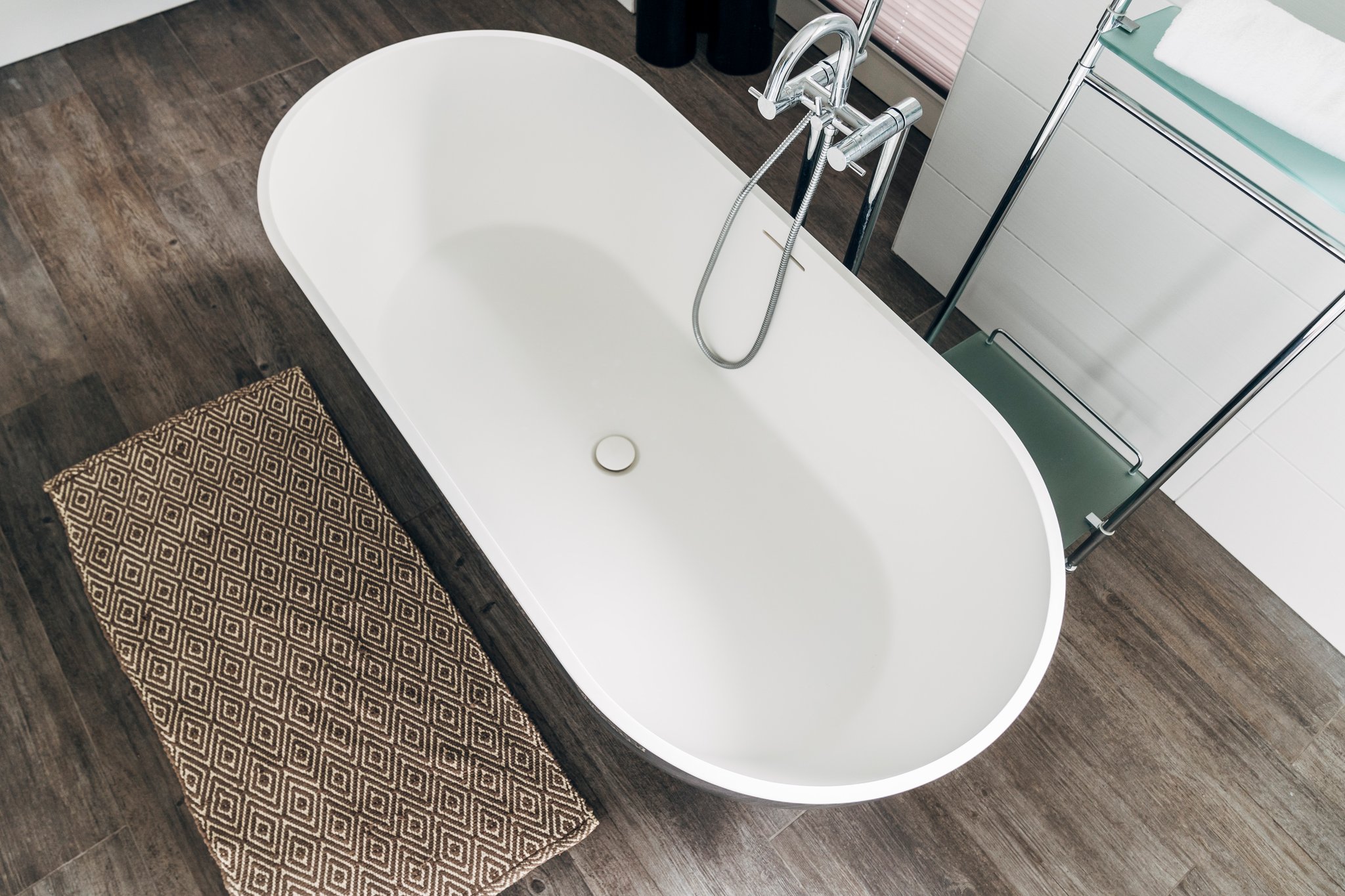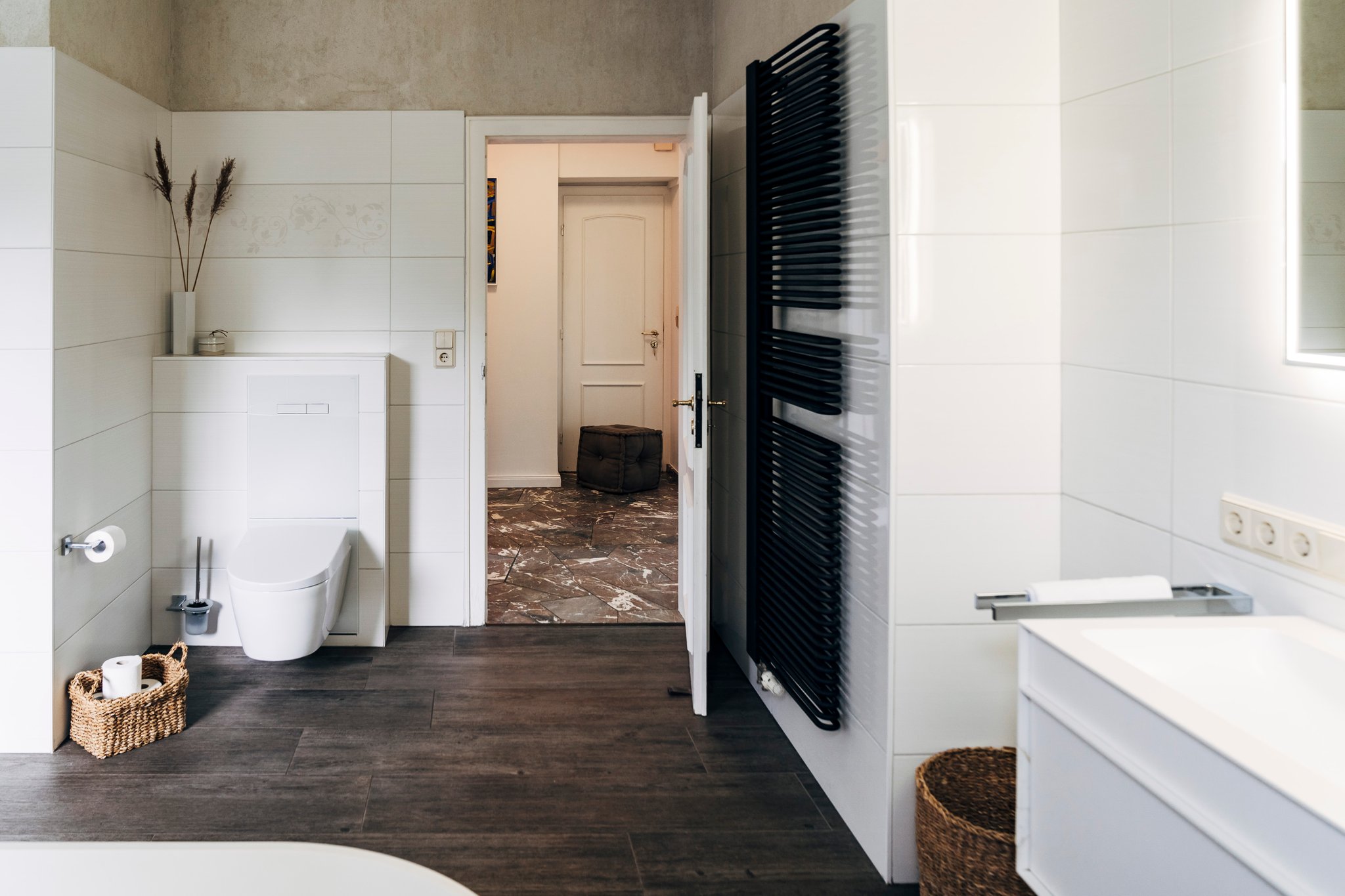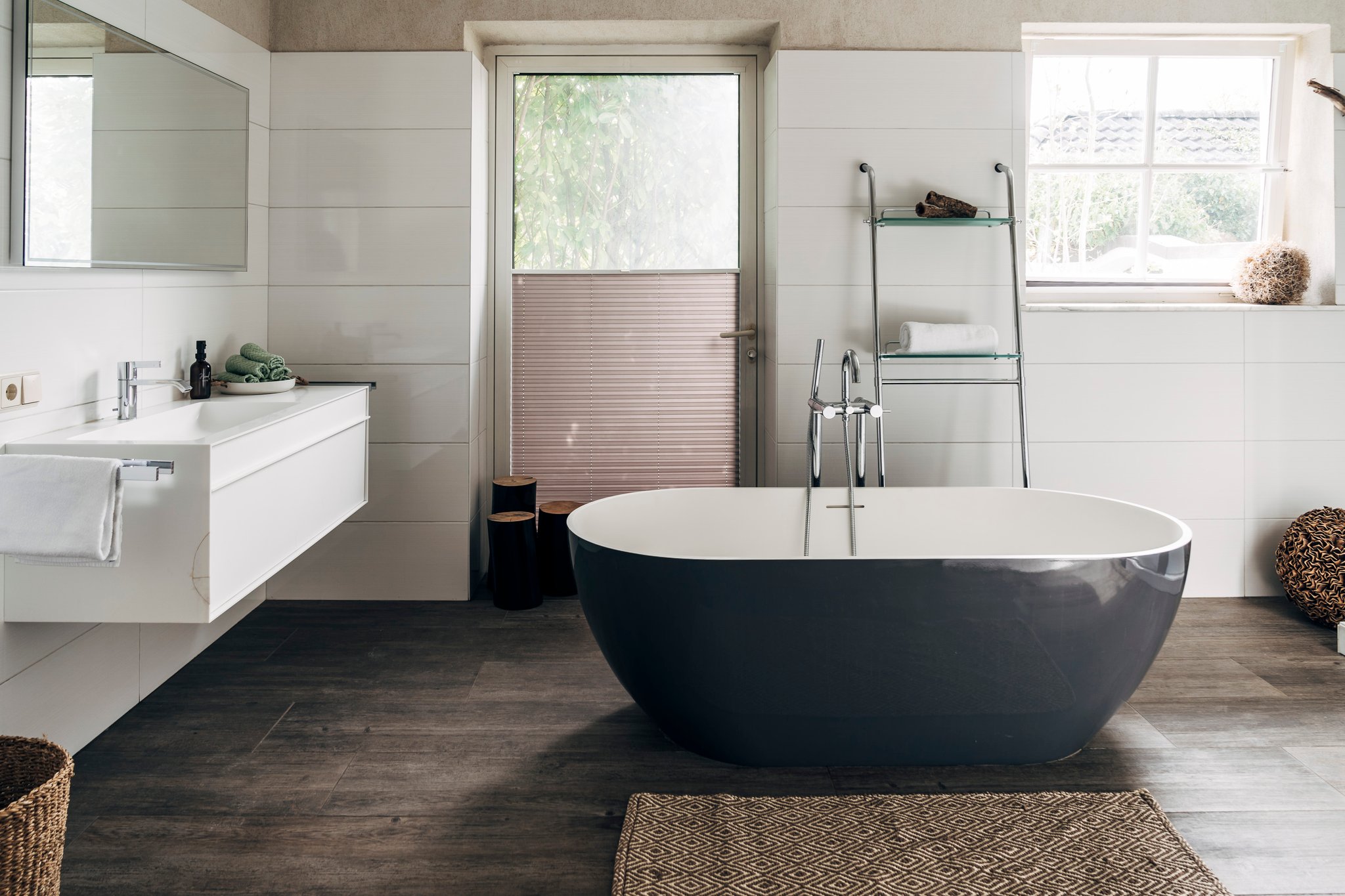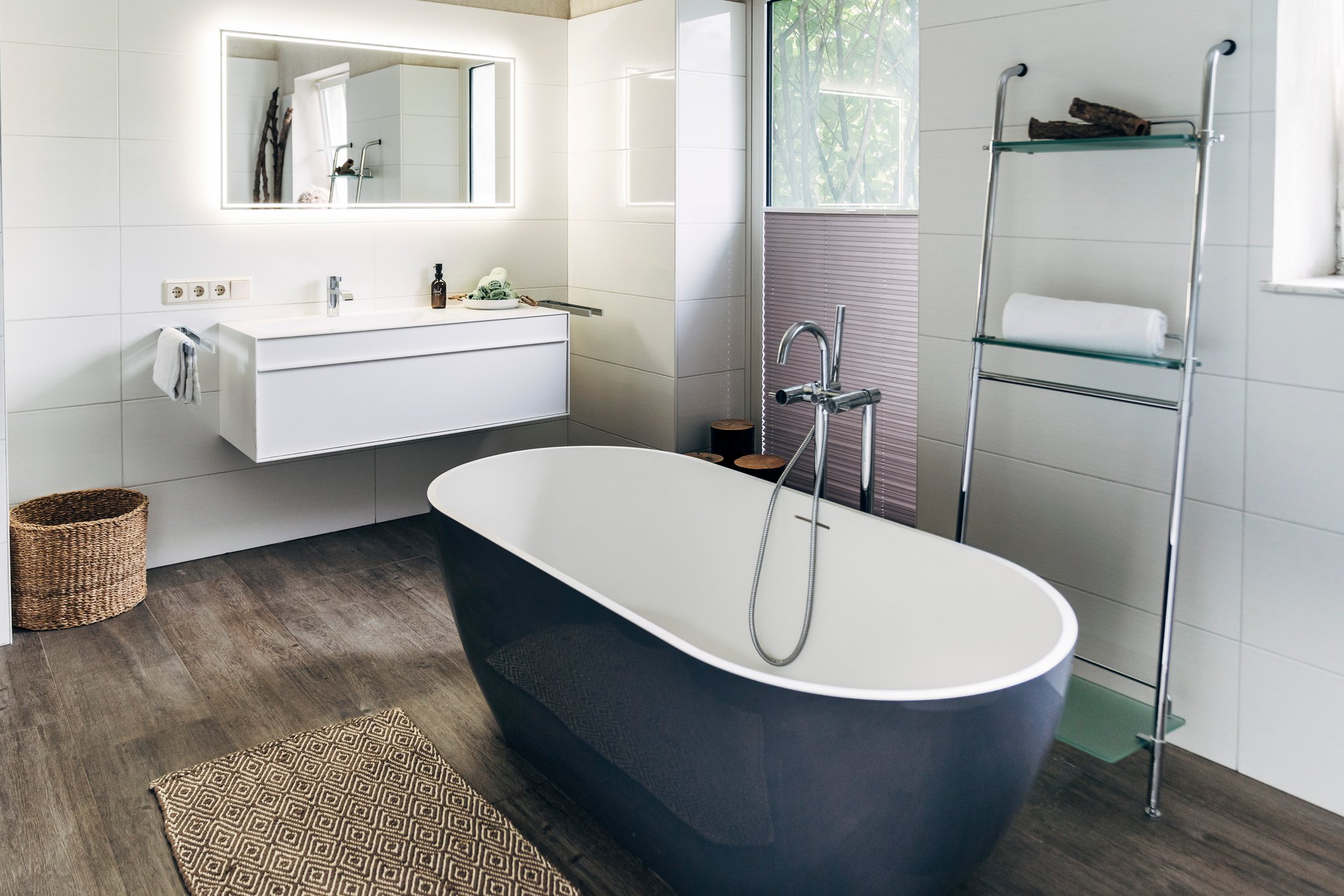 Das moderne Badezimmer mit seiner freistehenden Badewanne, Handtuchheizkörper und einer Dusche laden zum Verweilen ein.
