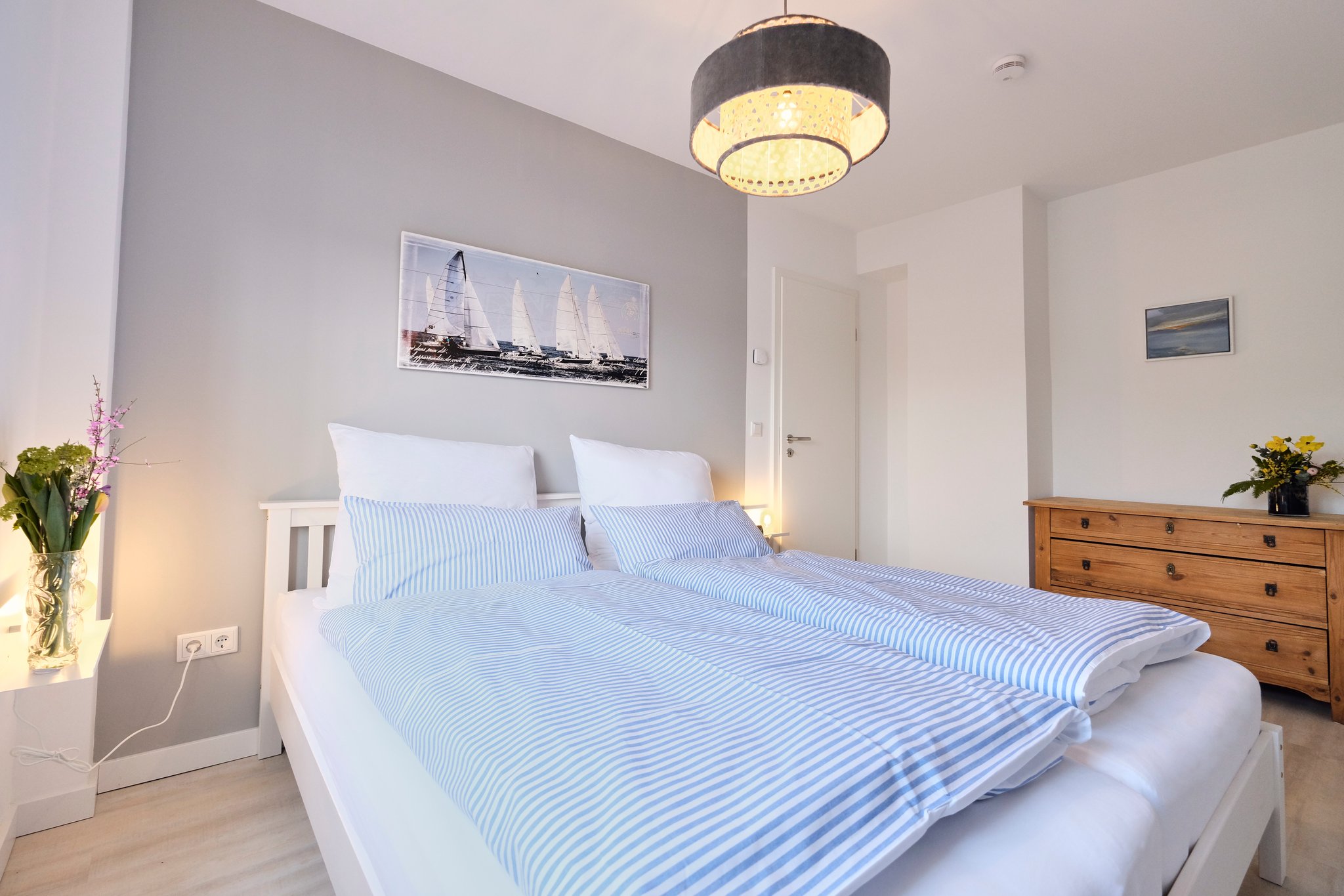 Die 5 -Zimmer-Wohnung ist mit zwei Doppelbetten, zwei Einzelbetten und einem Etagenbett ausgestattet. Sie kann mit bis zu 8 Personen bewohnt werden, Nutzung von WLAN ist kostenfrei möglich. Die moderne und voll ausgestattete Einbauküche ist ideal für Selbstversorger. Die Wohnung verfügt über ein neues Duschbad mit WC.